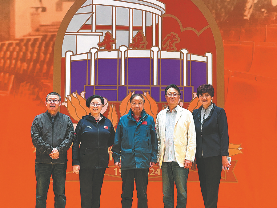 Guests, including Zhang Heping (middle), Tan (second from right) and Xu Jian (right) at the ceremony marking the 25th anniversary of the reopening of the concert hall in Beijing on April 22. CHINA DAILY